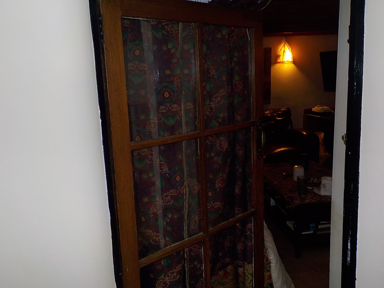 Damaged decoration behind the lounge curtain was dry at the time of inspection. The location behind the curtain together with the height from the floor suggest that condensation is the likely cause