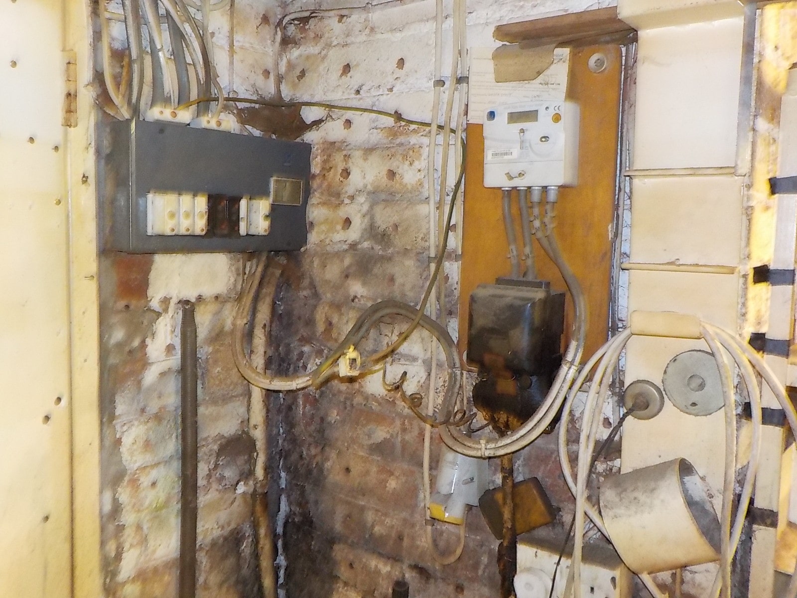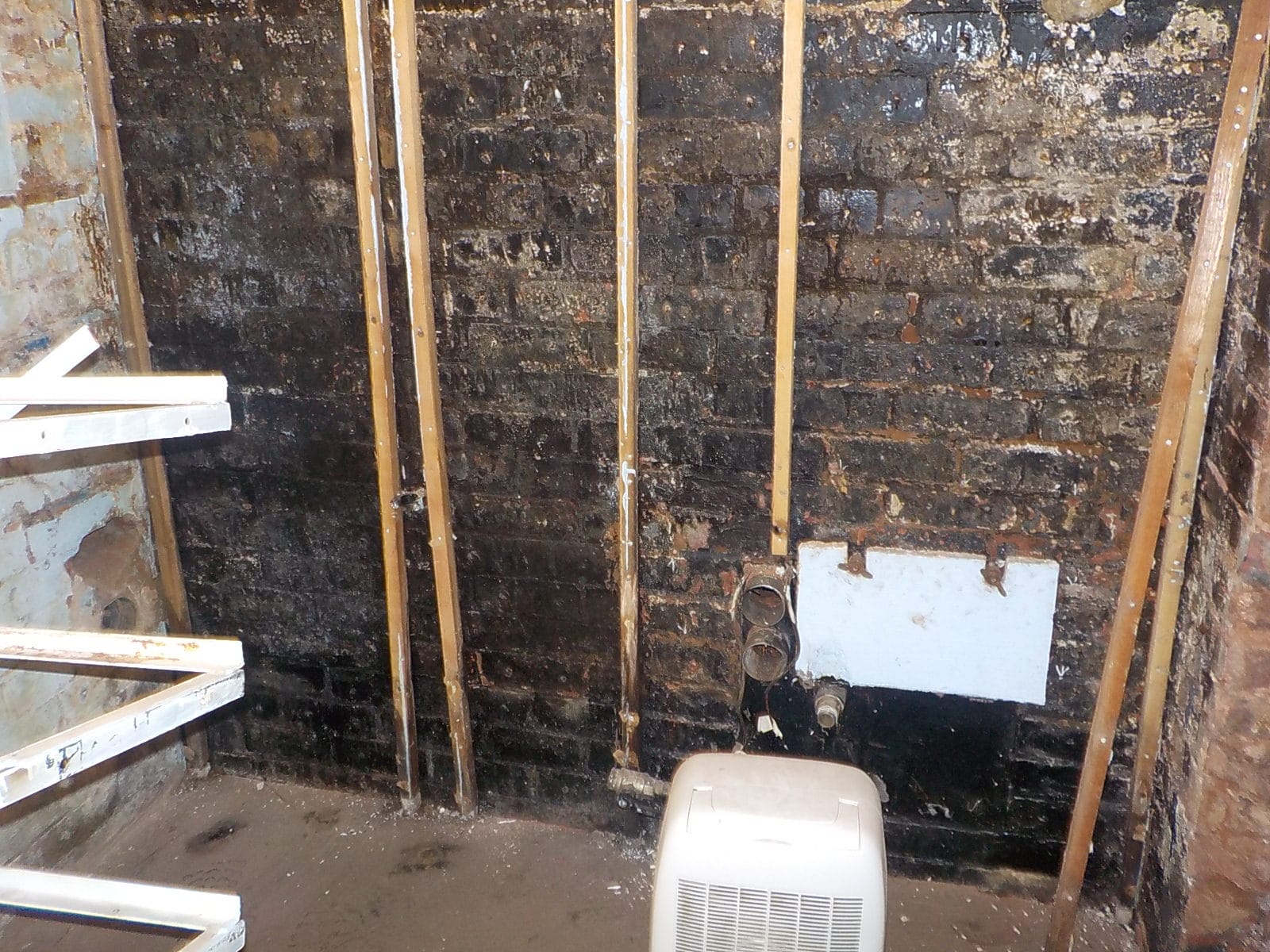 The black area is where an underground water tank has leaked behind the wall. The damp has been contained by an impervious lining and spread