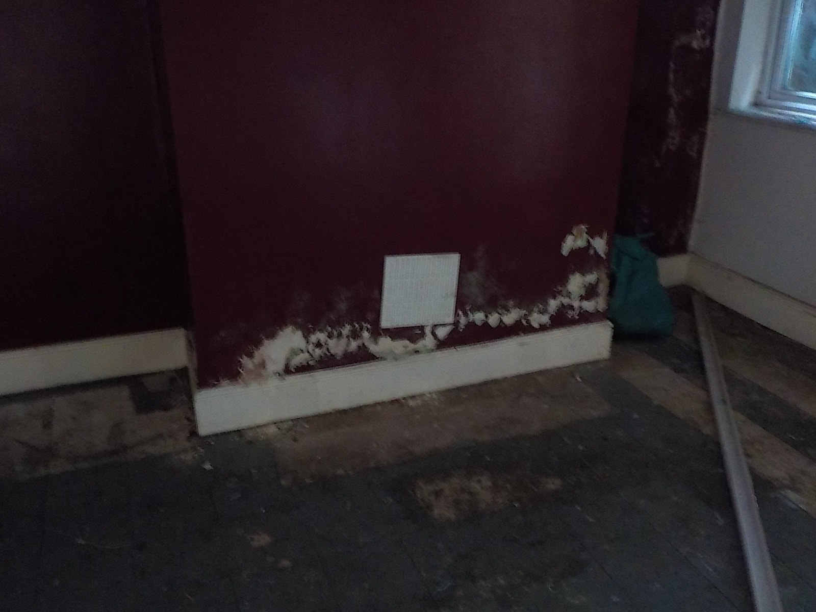 The missing / rotten skirting board is likely to be due to water spillage as there was no evidence of dampness in the plaster of the wall.